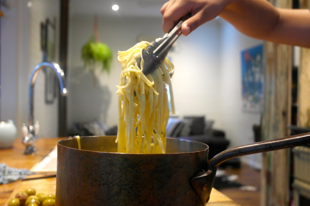Enough cooked pasta for 4 people, plus a tablespoon or two of the water it was cooked in