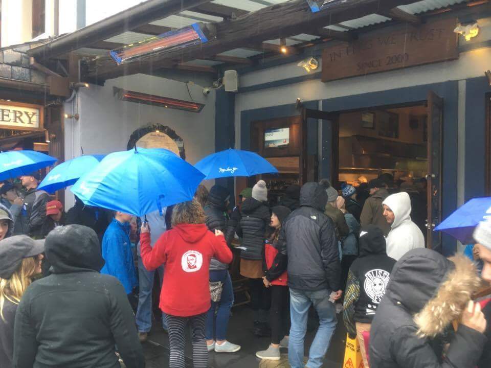 On the day that we passed through that little city, with it’s “experience Queenstown” and “Snow New Zealand” shops literally outnumbering the people in the streets by 2-1, it was experiencing a little of the ol’ wet stuff from the sky coming down (which was a relatively new NZ experience for us as it was all white fluffy stuff from the skies until now). Was this enough to deter the locals and tourists alike from lining said footpath in search of said Fergy goodness? Fuck no it was not. They were there, we were there and there was also a heap of staff there too – some taking orders, some making the orders and one nice young lady was handing out umbrellas to those in the queue who wanted one. We thought that was pretty nice. “Ferg really does love us”, we comment to ourselves.
