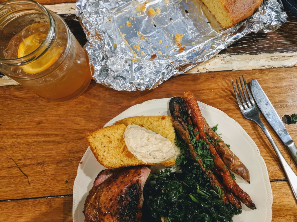 We served it with roasted carrot and sweet potato, braised kale, cornbread and homemade chicken gravy and I must say, it was damn well delicious.