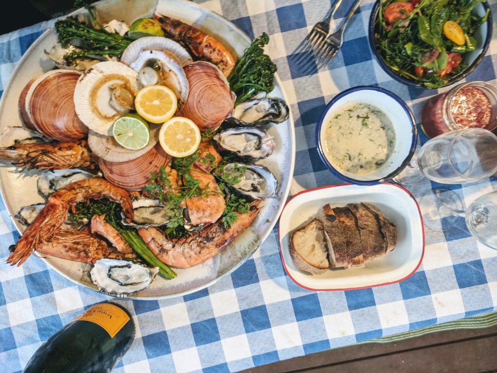2. Once the children have stepped out of the car and the doors have been closed behind them it is time to head straight down to your local purveyors of home entertainment goods, quality seafood and booze and, in that order, get yourself a new home entertainment system – something big… and in colour… and with wireless remote control. Yeah, we’re going all out on this one (or maybe you already have one of these and this step can be omitted), get a pile of fresh seafood – we chose prawns (shrimp), scallops, ocean trout and oysters, and defo get some quality booze of some kind – some ingredients for a mojito plus a decent bubbly for later was a pretty good call methinks.