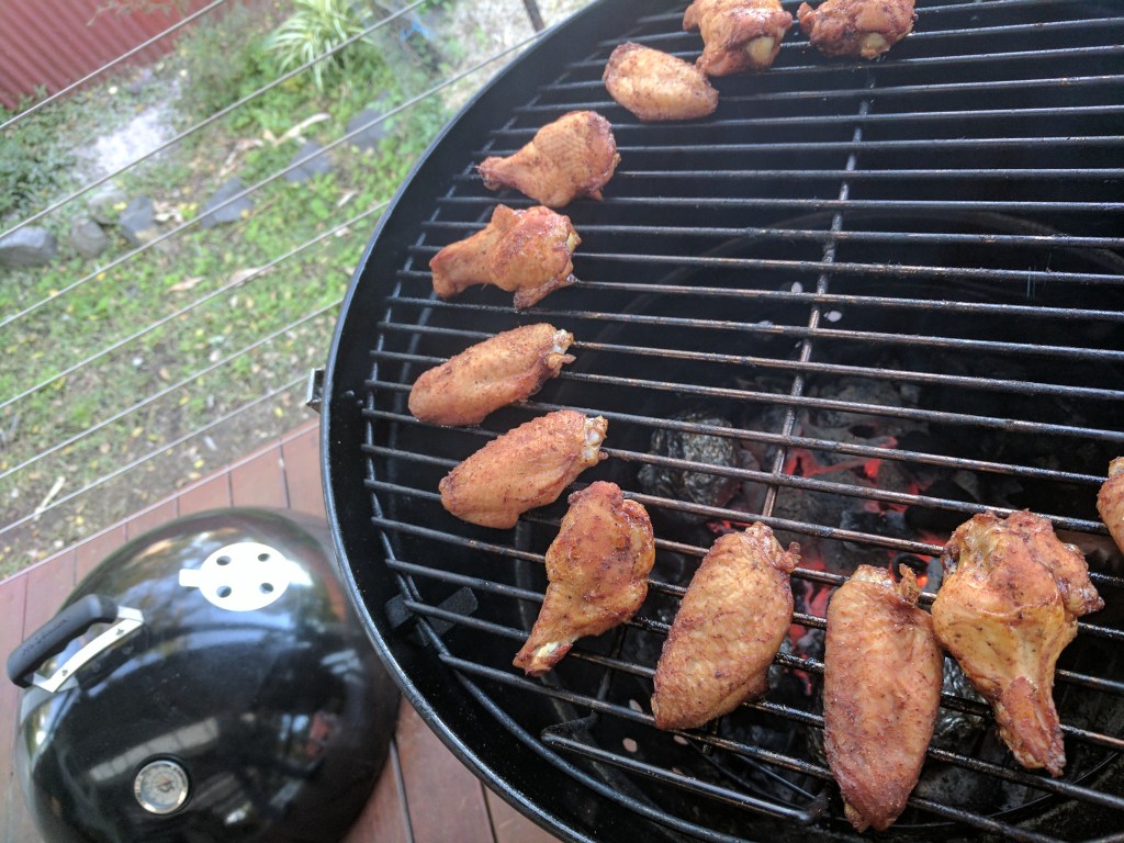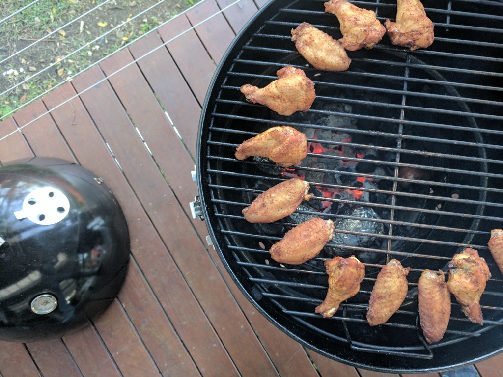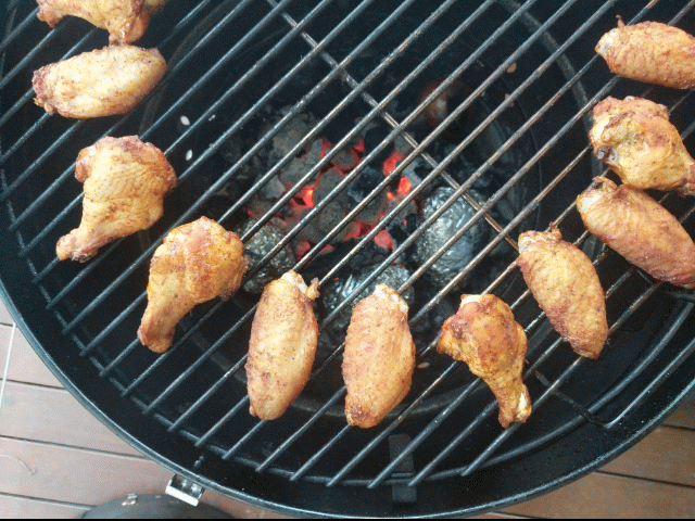 Place the wings on the grill however you see fit… a nice little around-the-rim pattern seems to be quite vogue right now.