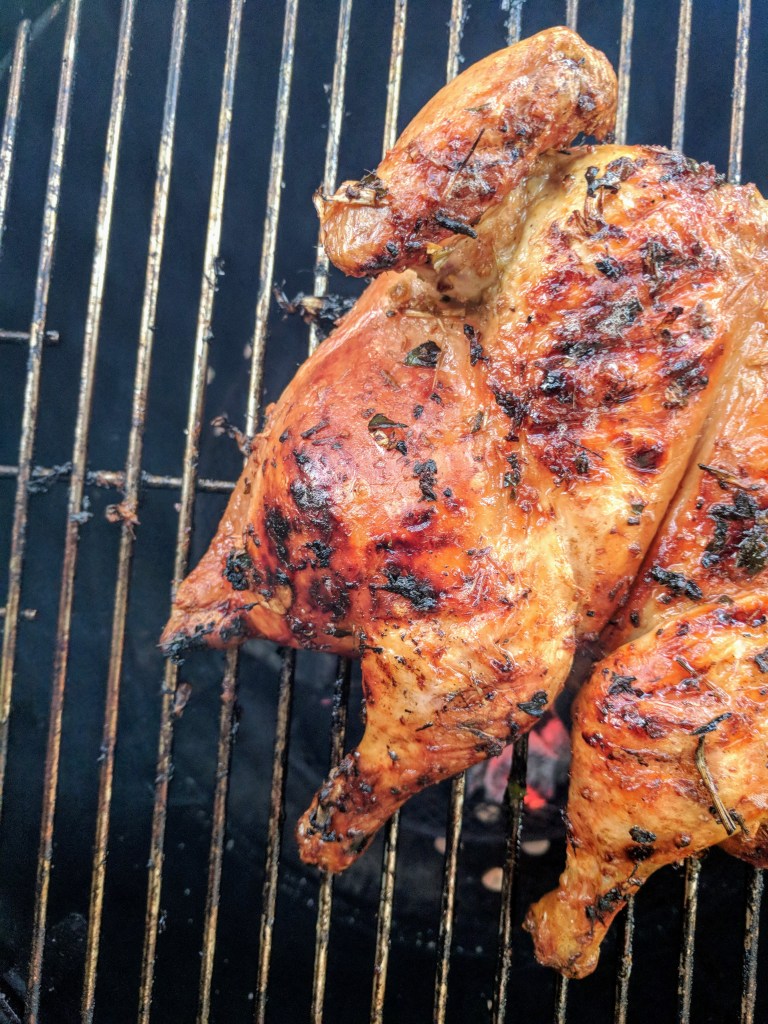 Grill chicken over medium-hot coals for 45 or so minutes or until chicken is cooked (you may need to move your chicken away from direct heat if it starts to get a little too crispy or charred). Turn and rotate chicken every 10 – 15 minutes to ensure a fairly even cooking process.