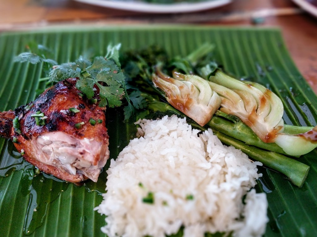 This meal also contains a few of my current favourite* garnishes – sticky rice, steamed greens with oyster sauce and a sweet and sour dipping sauce.