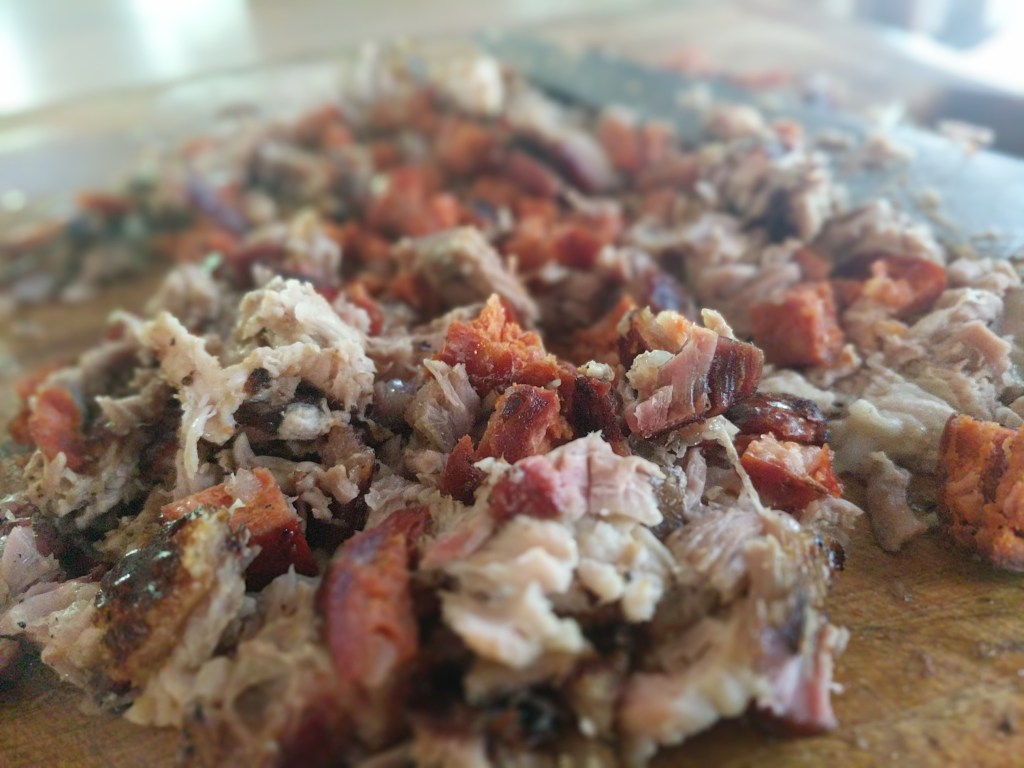 Chop the pork belly and chorizo up together