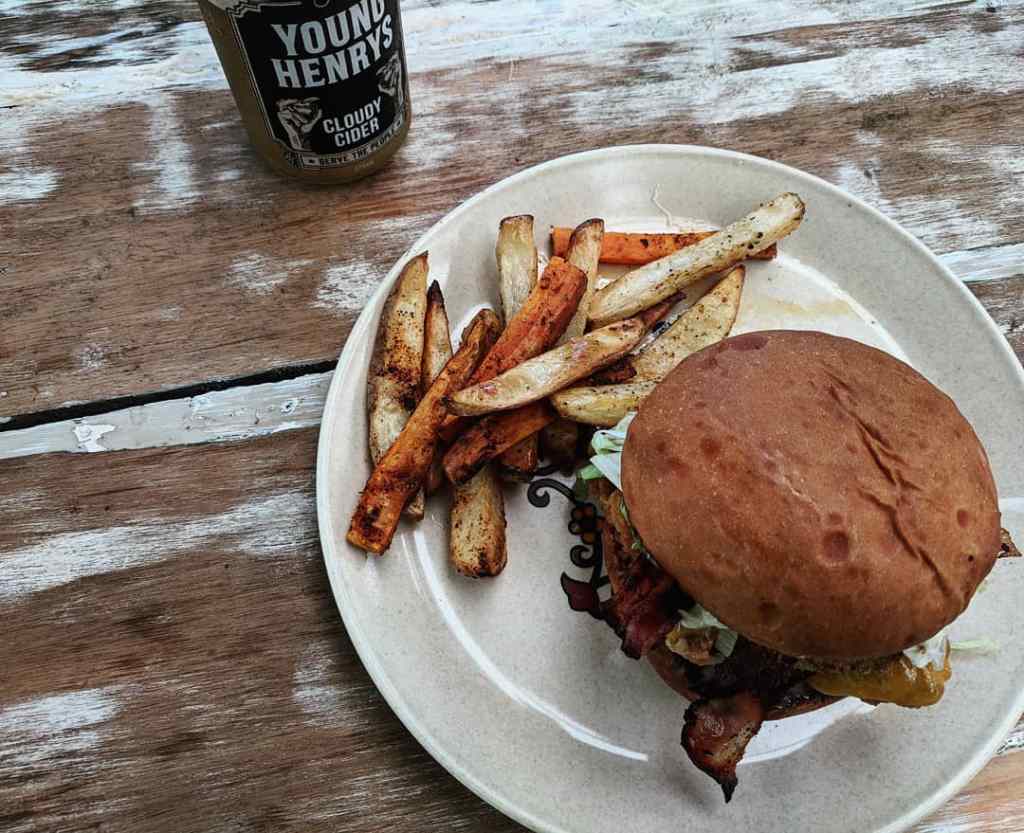*burgers are pretty much always accompanied with chips (fries) and a tasty beverage (beverage).