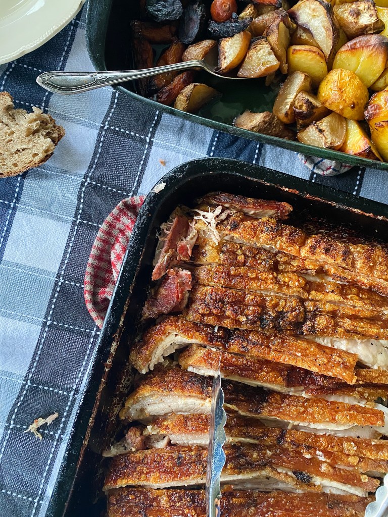 Rub the skin of the pork with more salt… A really good pinch of salt… pork skin really loves a good hit of salt.