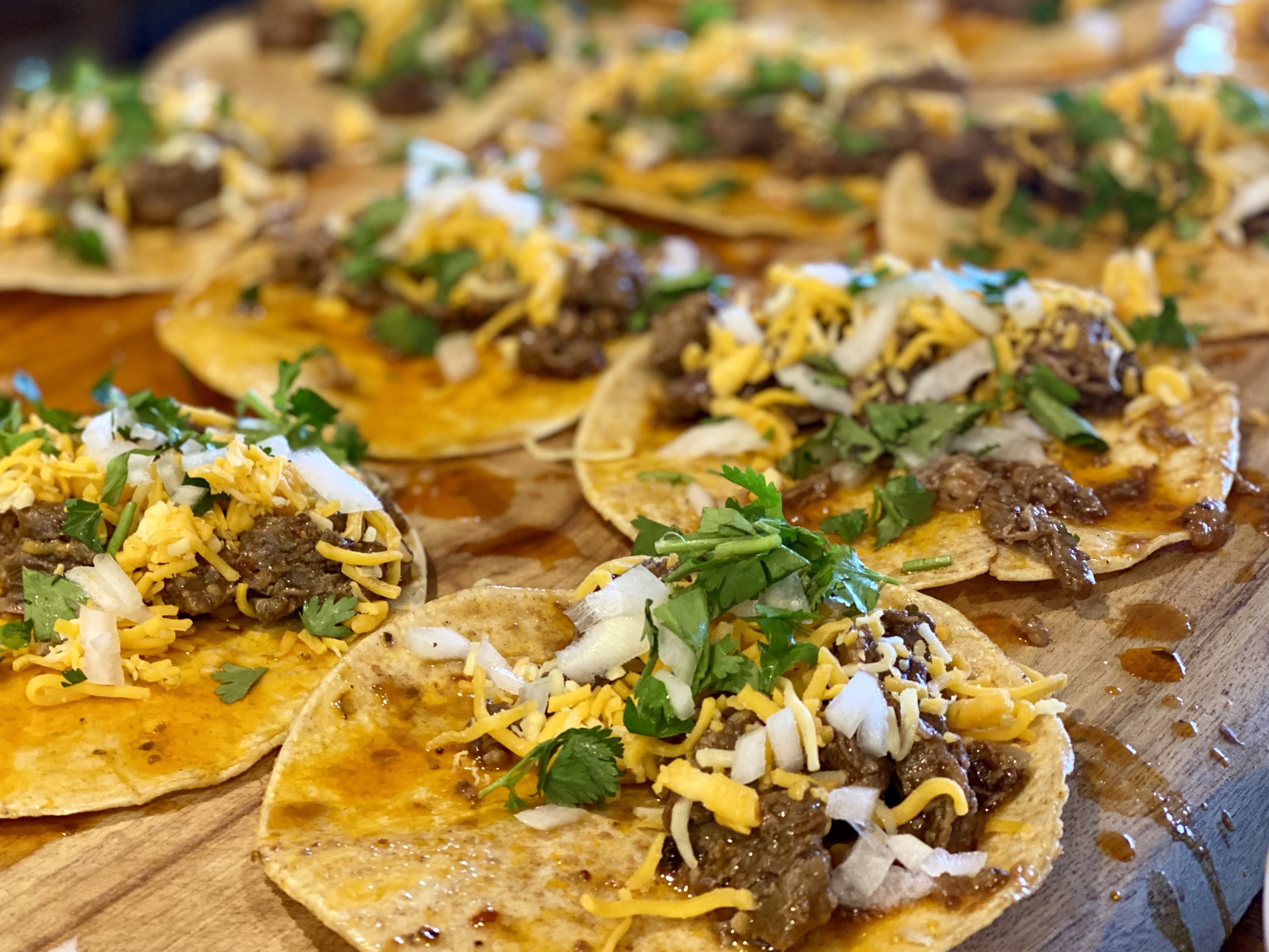 Build your tacos with enough shredded brisket to cover half of the tortilla, plus a little cheese, onion and coriander.