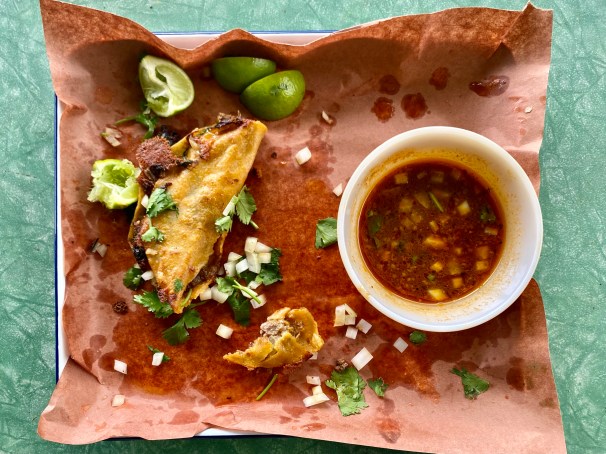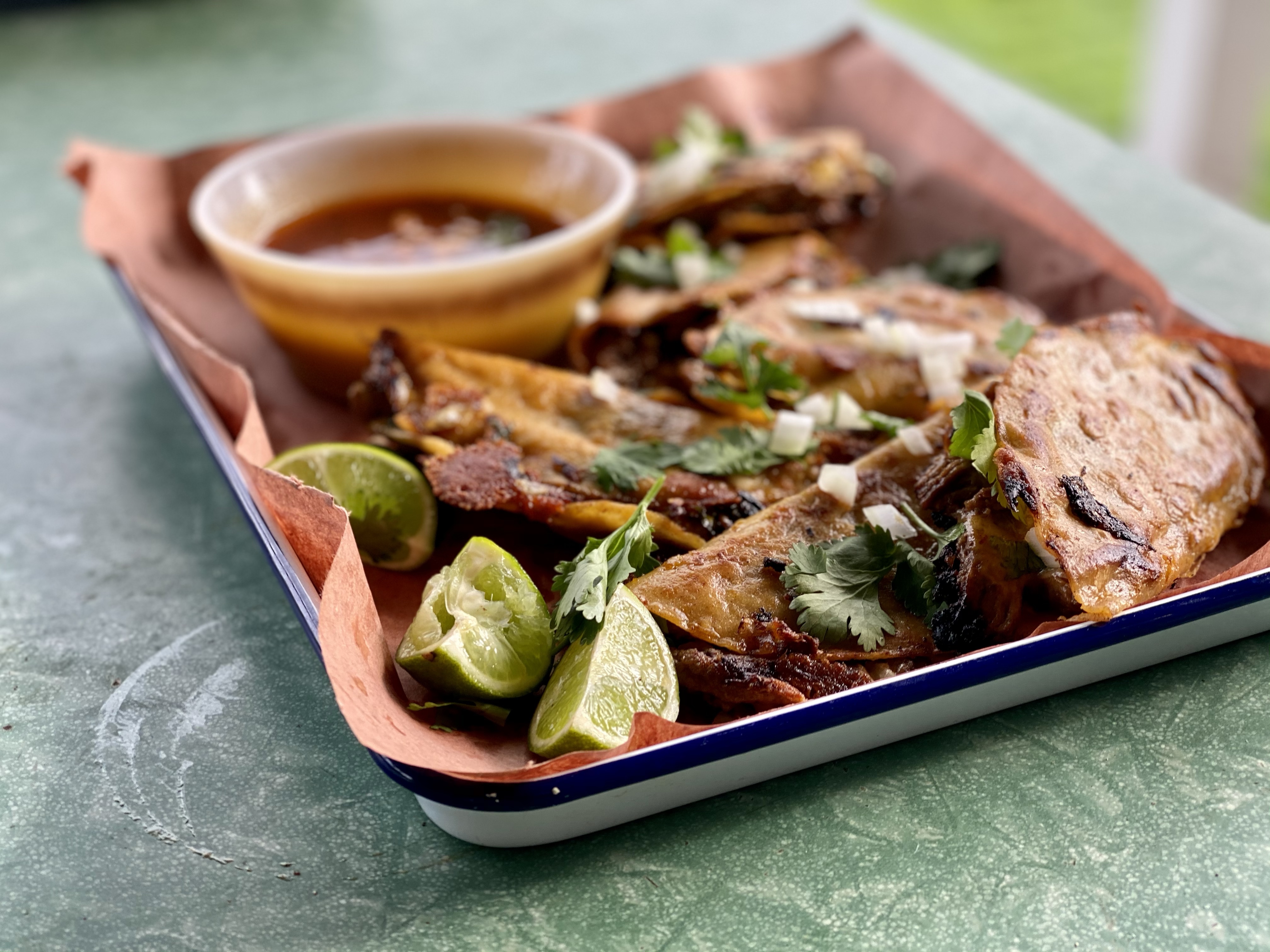 This is brisket cooked down in a spicy, aromatic broth until its pull apart tender (and that broth is spicy and aromatic with things that are not just cumin, chilli and oregano), then the meat is shredded and put into tortillas which are dipped in the broth and then the tacos are cooked on the flat grill and then served with more broth for dipping, AKA sex appeal. Does that sound a little too complicated for you? Well, sometimes life is a little complicated sweetie pie, and you’ve just got to put a little extra effort in for full points at the end.