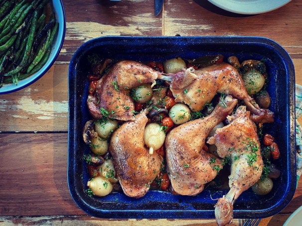 I’ve made a couple of slight changes to a traditional coq au vin due to what was in the house at the time – I swapped out red wine for white and added some cherry tomatoes because we have a fuck load of them in the garden at the moment – but the rest of it is basically the same.