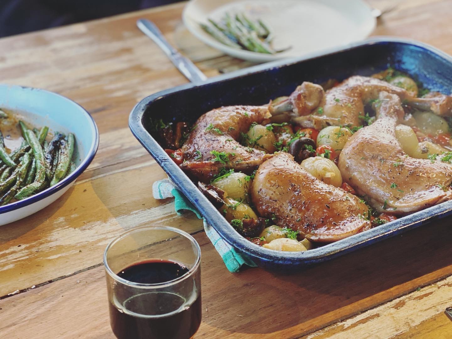 I’ve made a couple of slight changes to a traditional coq au vin due to what was in the house at the time – I swapped out red wine for white and added some cherry tomatoes because we have a fuck load of them in the garden at the moment – but the rest of it is basically the same.