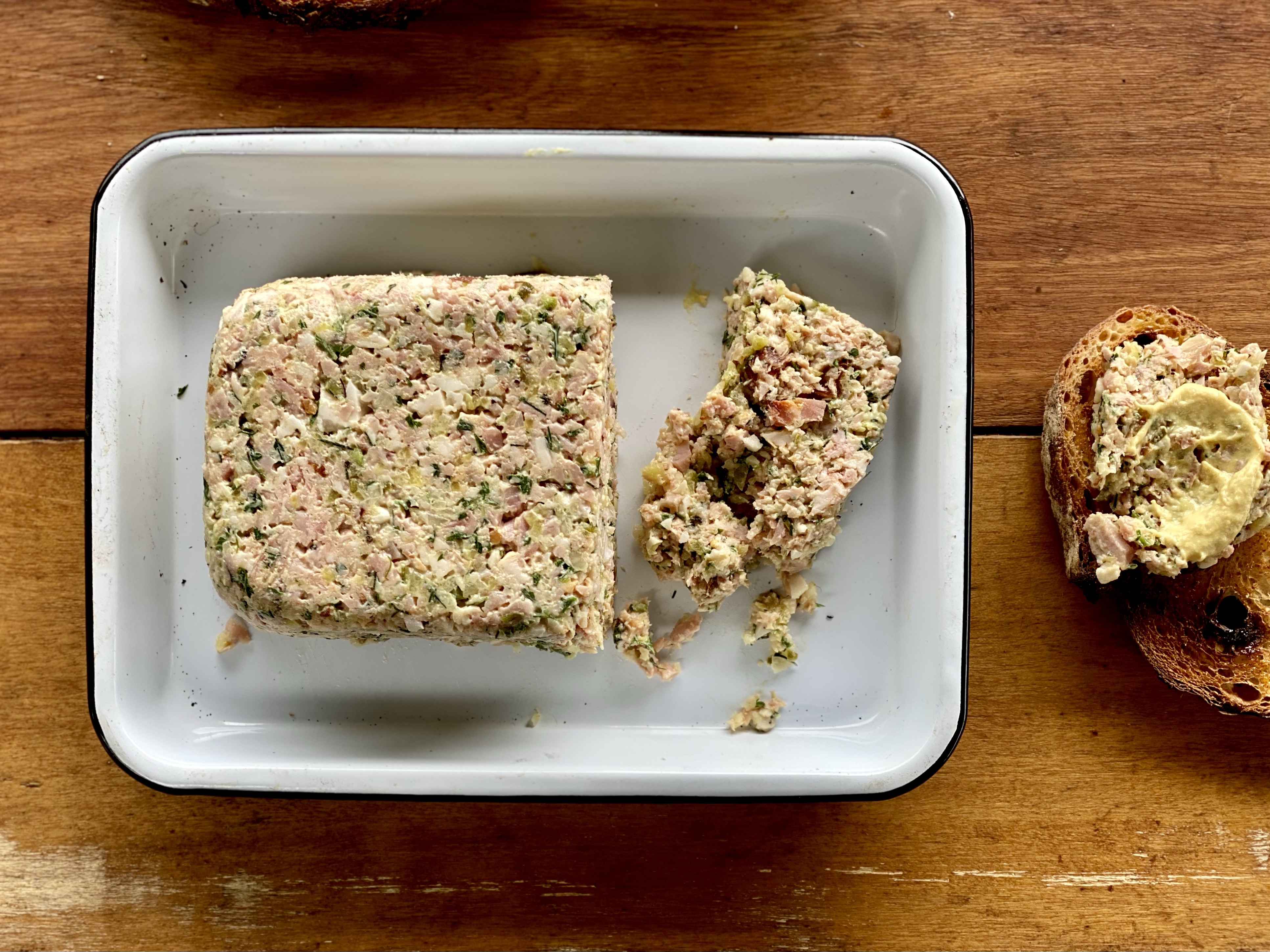 This terrine is pressed so it will hold its shape and you can carve it up all sexy like at the table, but it also works fine if you just dump the mix into a bowl and put it on the table for everyone to scoop onto toast as they please.