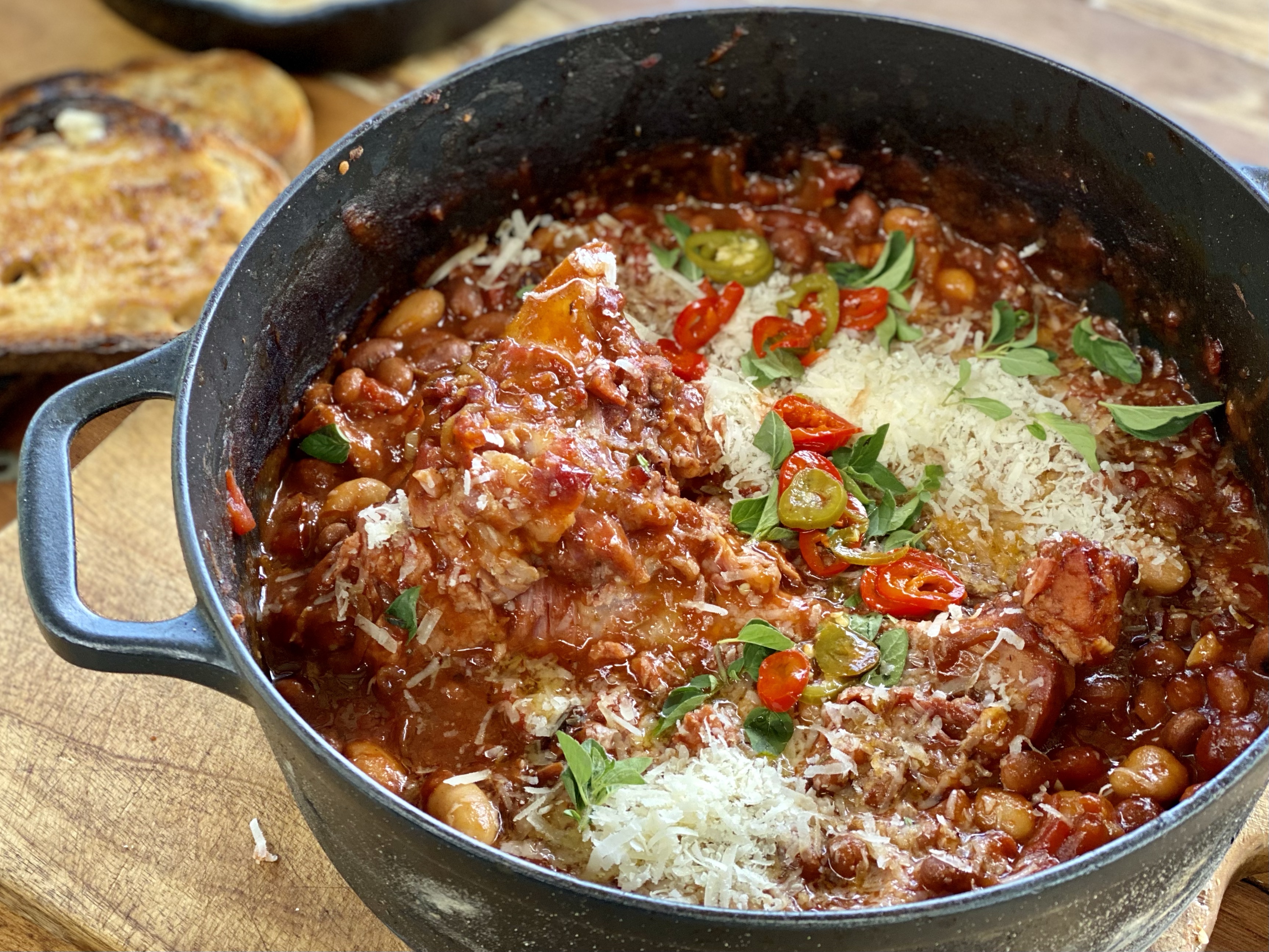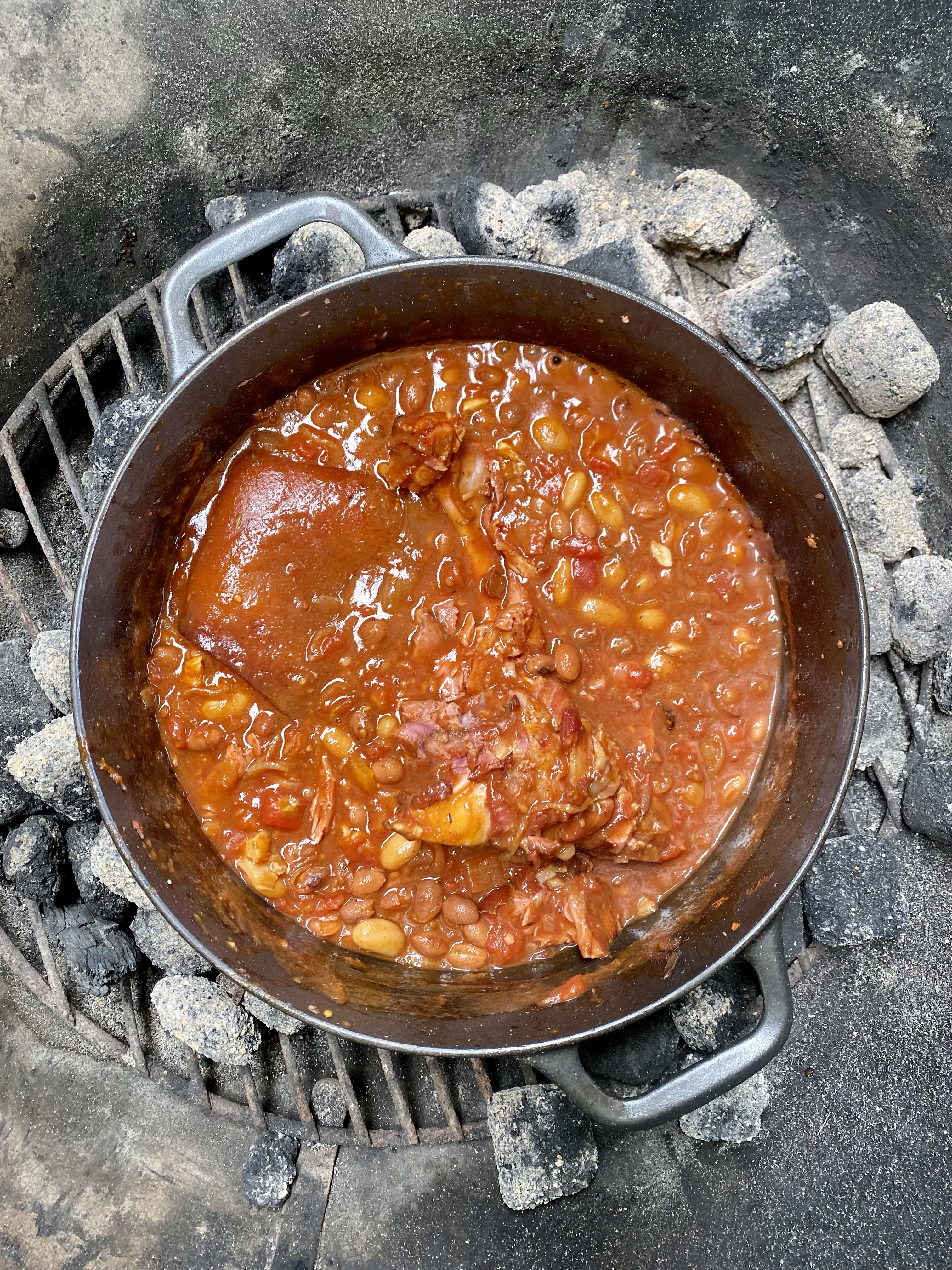 This recipe is a world away from one of those recipes where you have to follow it to the letter. Use different beans if you want, different herbs or whatever you got. As long as you have a bit of good smoked pork product in there I guarantee, yes guarantee, you will be a happy camper. Unless of course you are actually camping but hate the outdoors, in which case you will be the opposite of a happy camper. I’ve really got to get my story straight somewhere along the line.