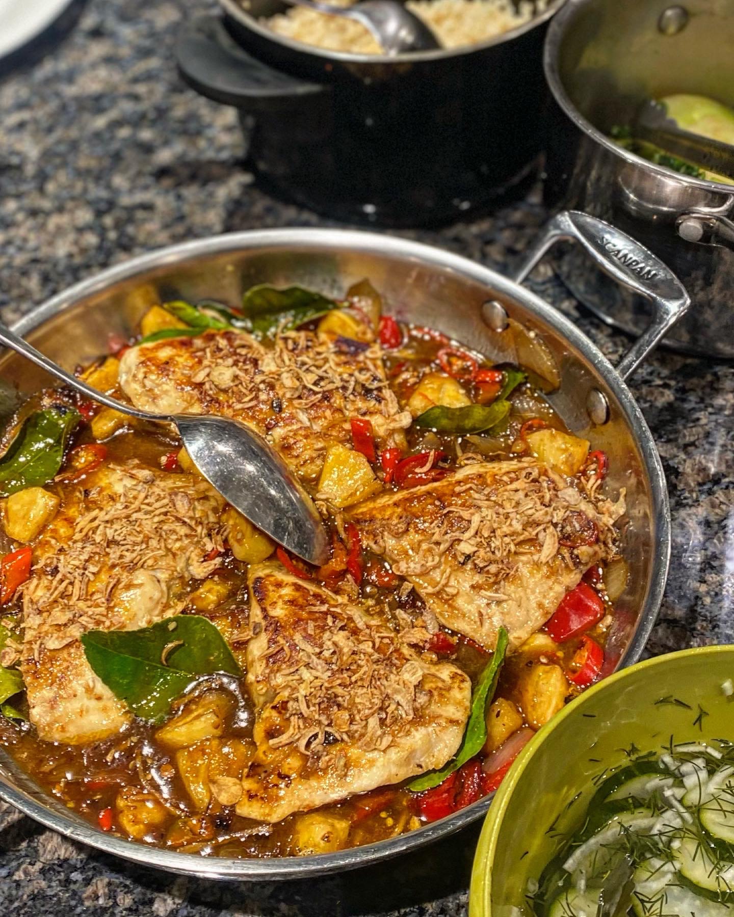 Cook paste out for a few minutes then add everything except pineapple, chilli and kaffir leaf.