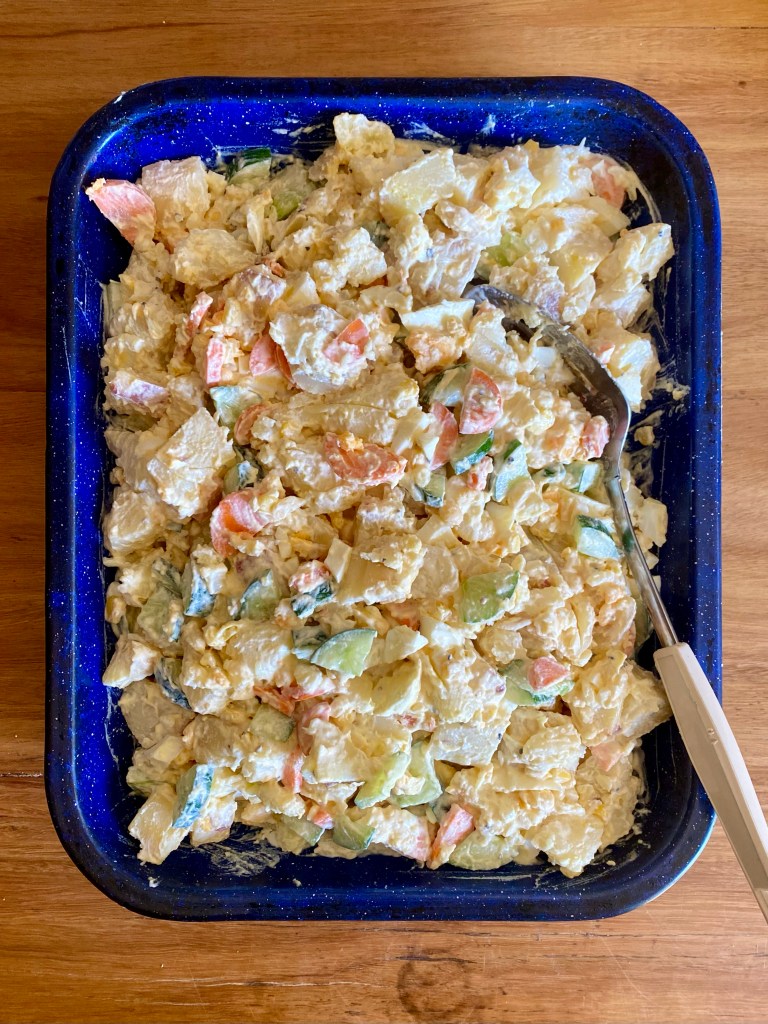 Combine all ingredients, roughing up the potato slightly as you go, and dress with mayonnaise.