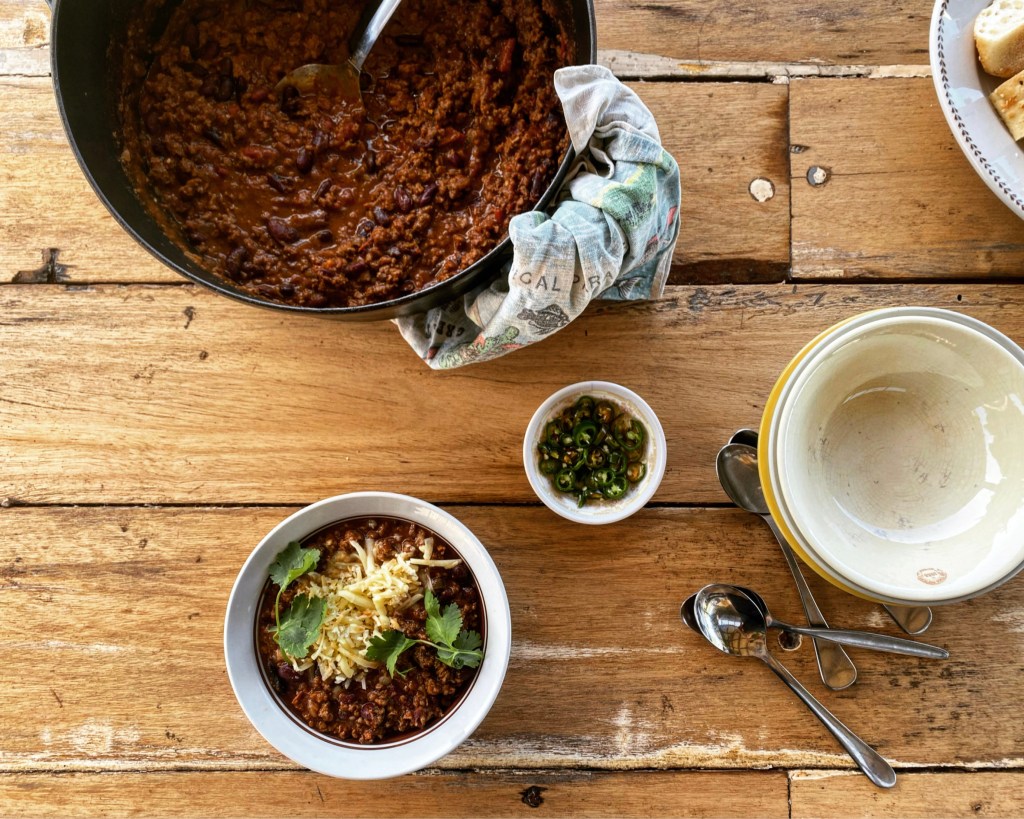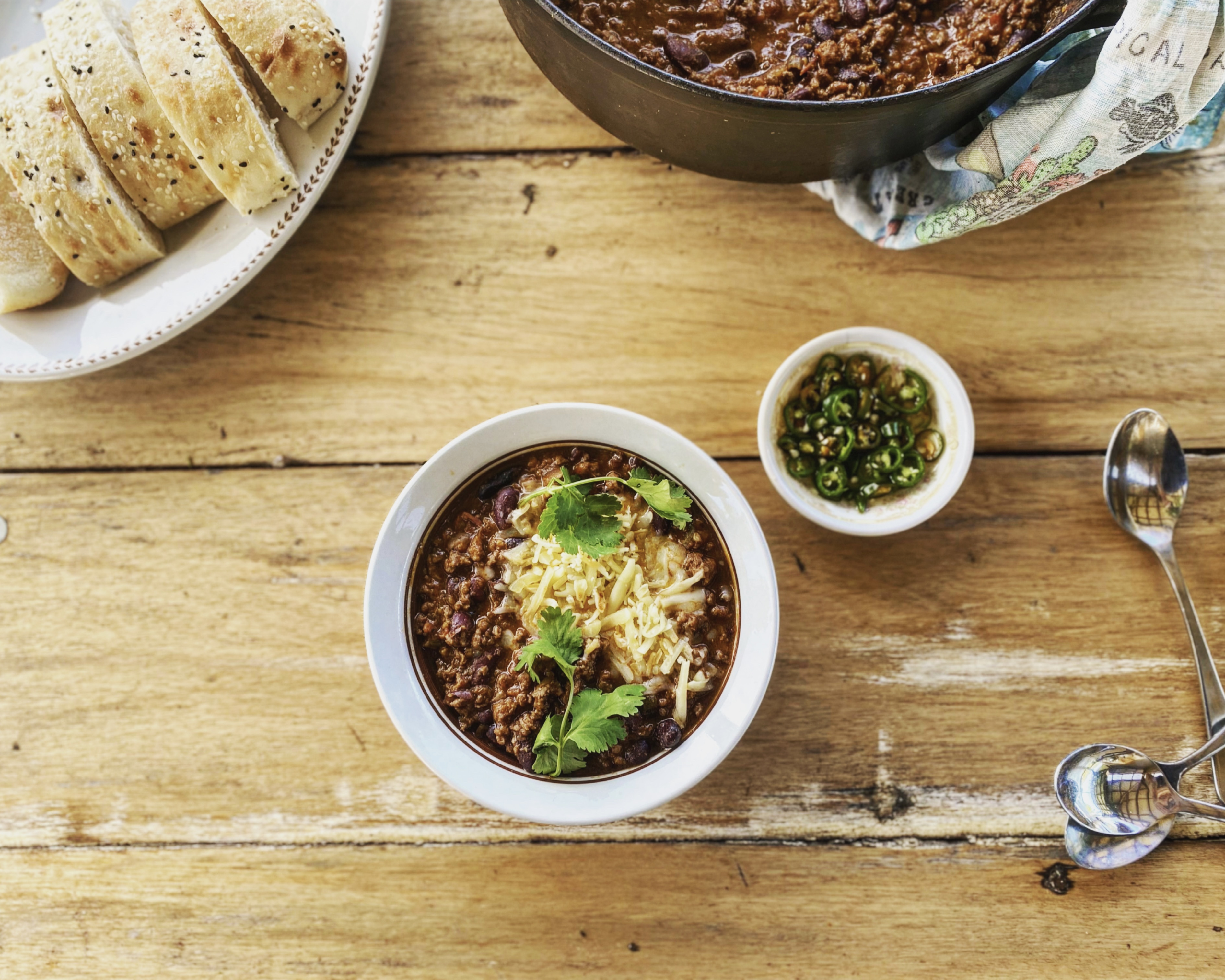 Get it onto the table with shredded cheese and extra chilli to garnish and a chunk of bread on the side.