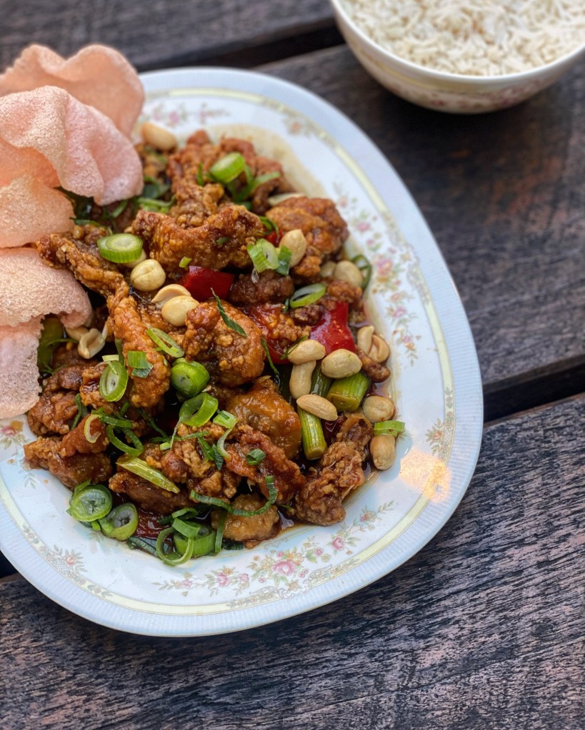 I’ve looked at a few recipes and then played around with a few things to create a sauce, and then I chucked a pile of crack chicken pieces into that and voila – my kung pao chicken.
