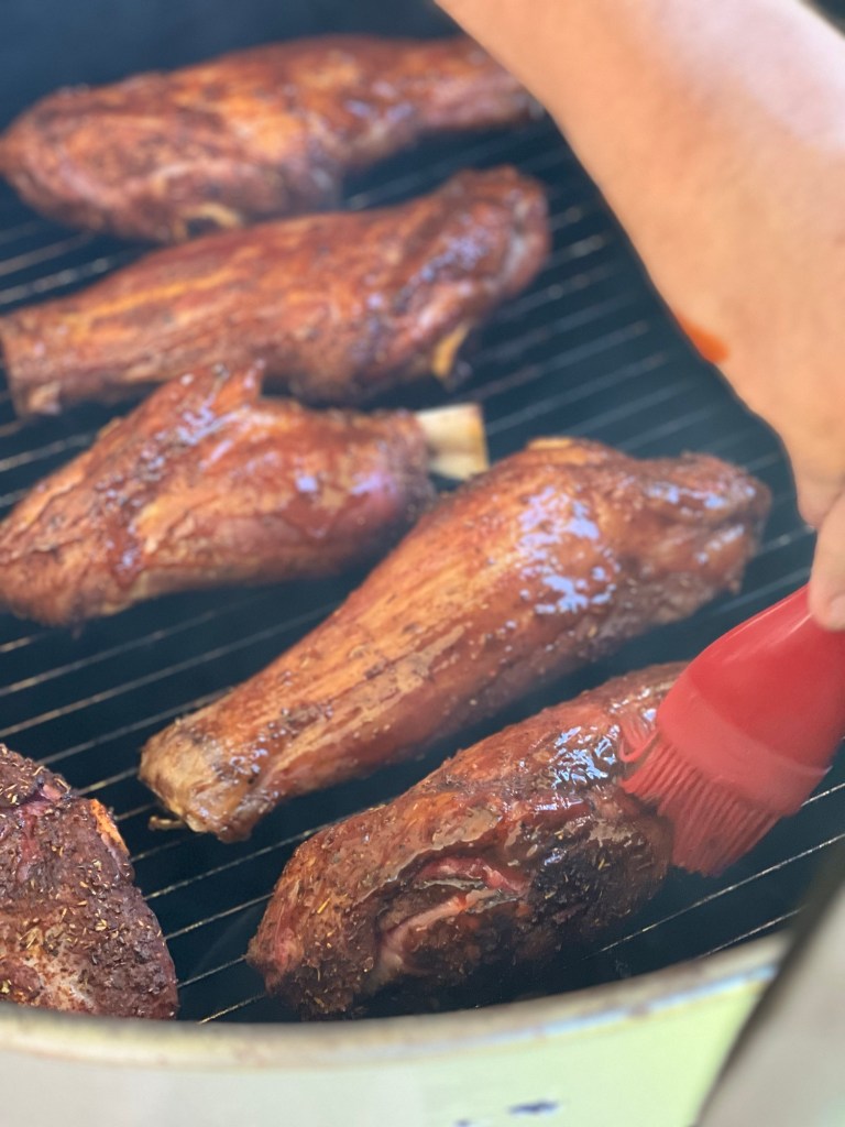Using a pastry brush, glaze shanks with a little BBQ sauce. Make sure you turn them over and do the job properly.