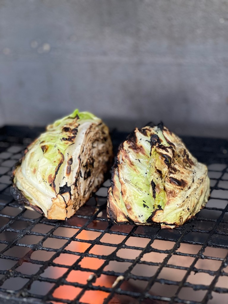 Turn regularly for 10 minutes or until it has a bit of char on all faces. The idea here is that the cabbage will be charred and smoky but not super soft.
