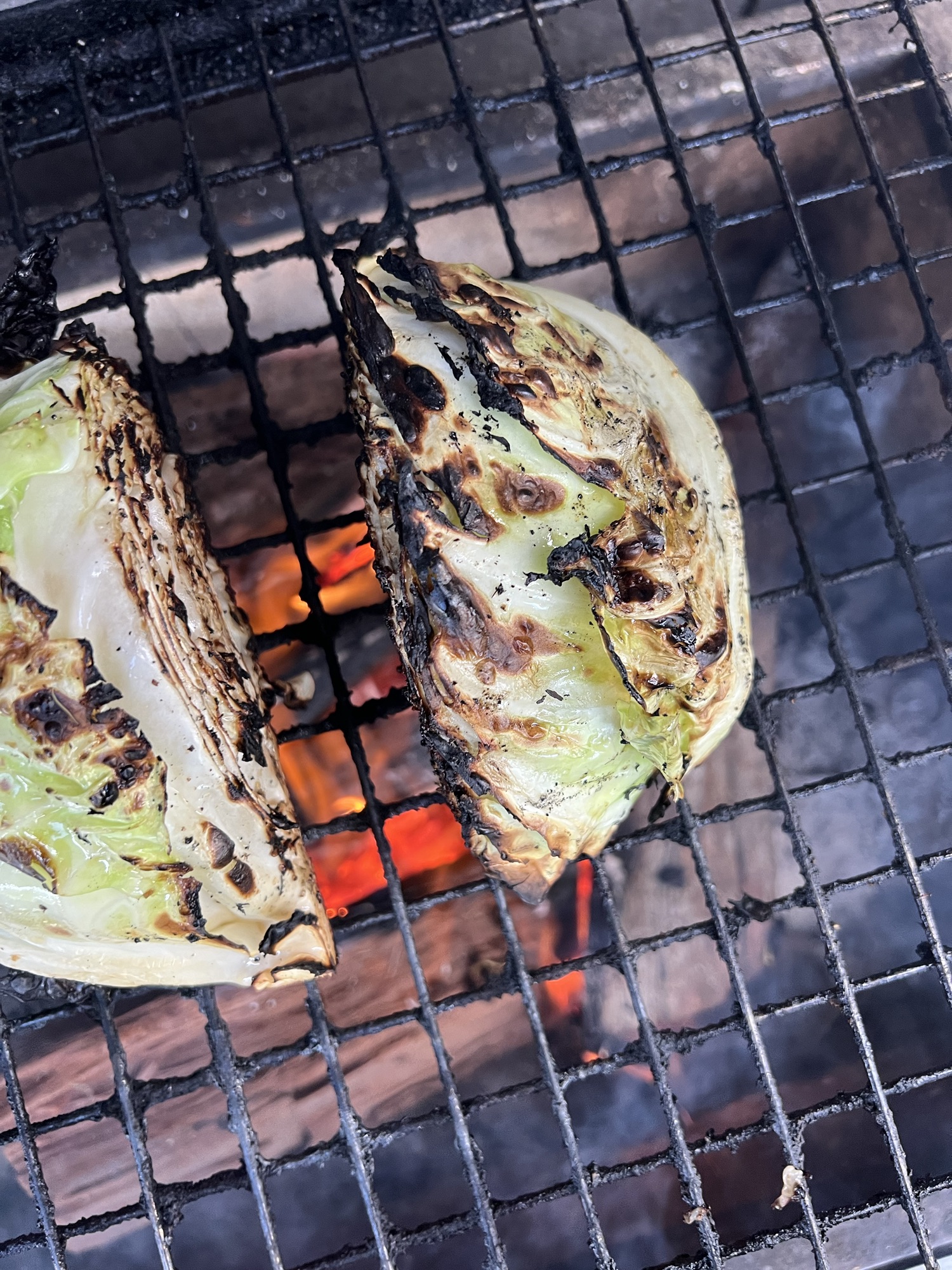 Turn regularly for 10 minutes or until it has a bit of char on all faces. The idea here is that the cabbage will be charred and smoky but not super soft.