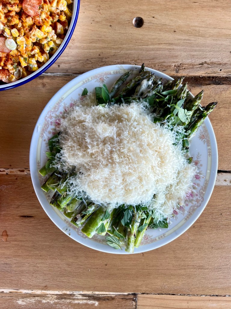 Lay asparagus onto a serving platter – don’t leave any of that mayonnaise behind, dump the oregano leaves on top and then the parmesan gets piled on top of that.