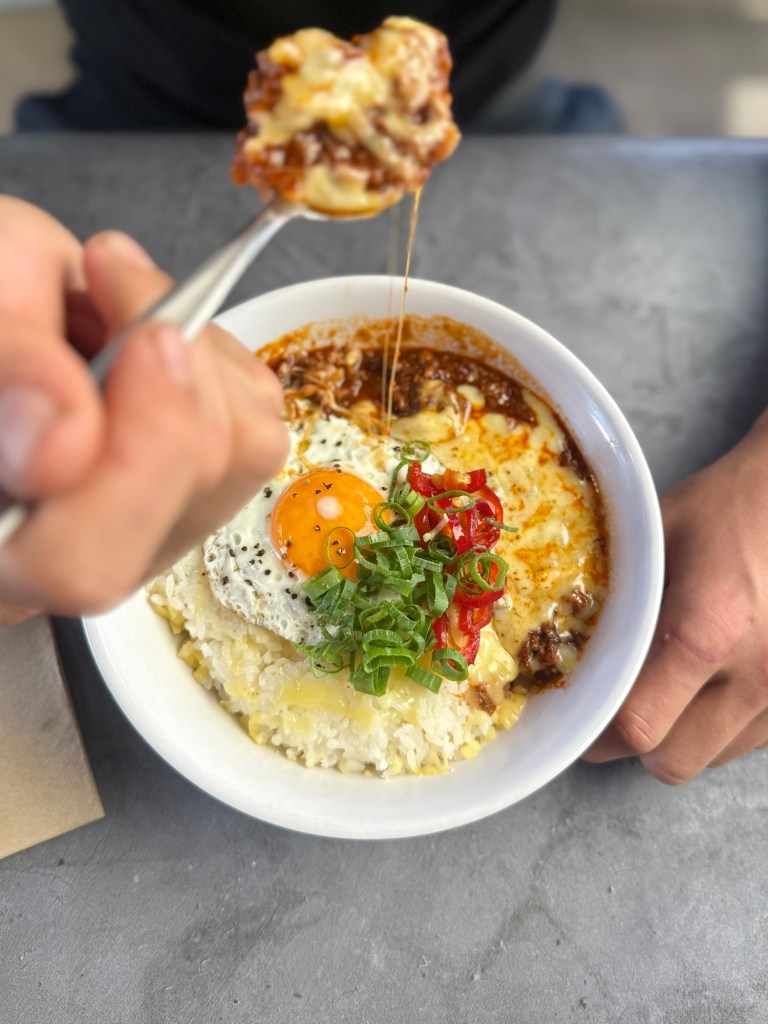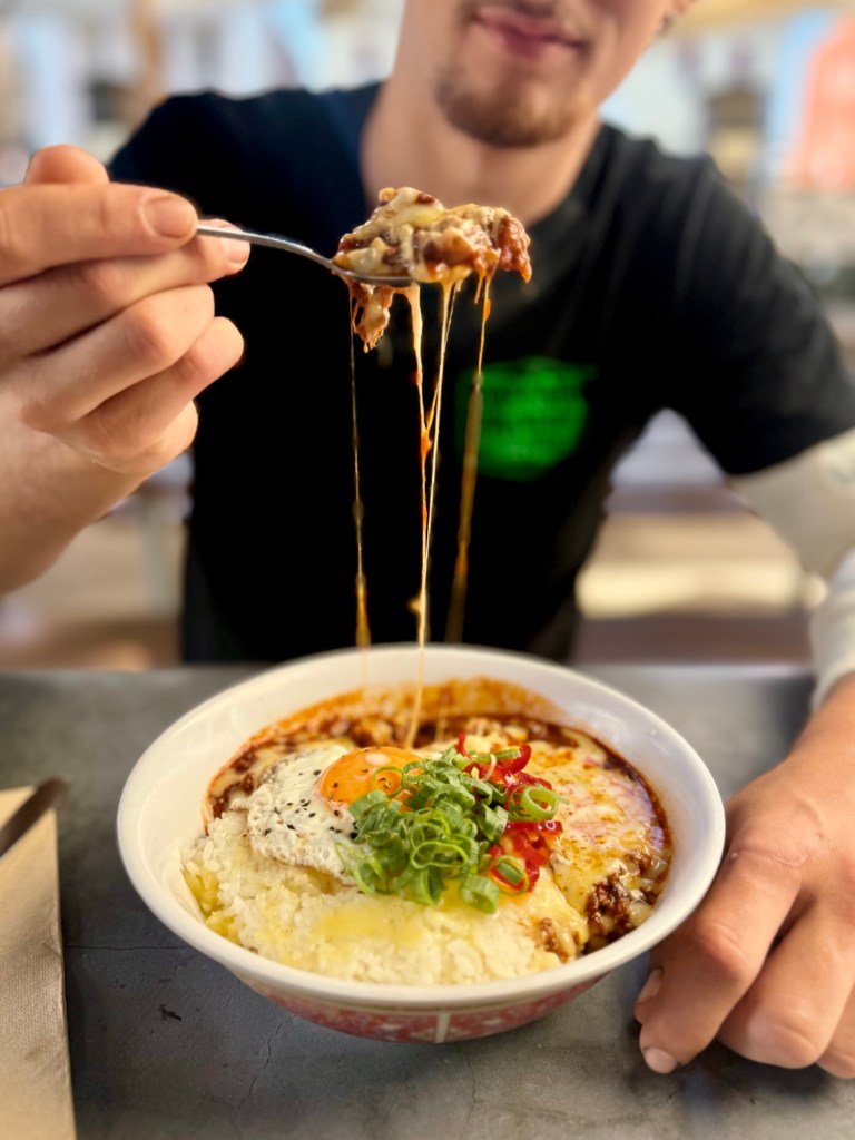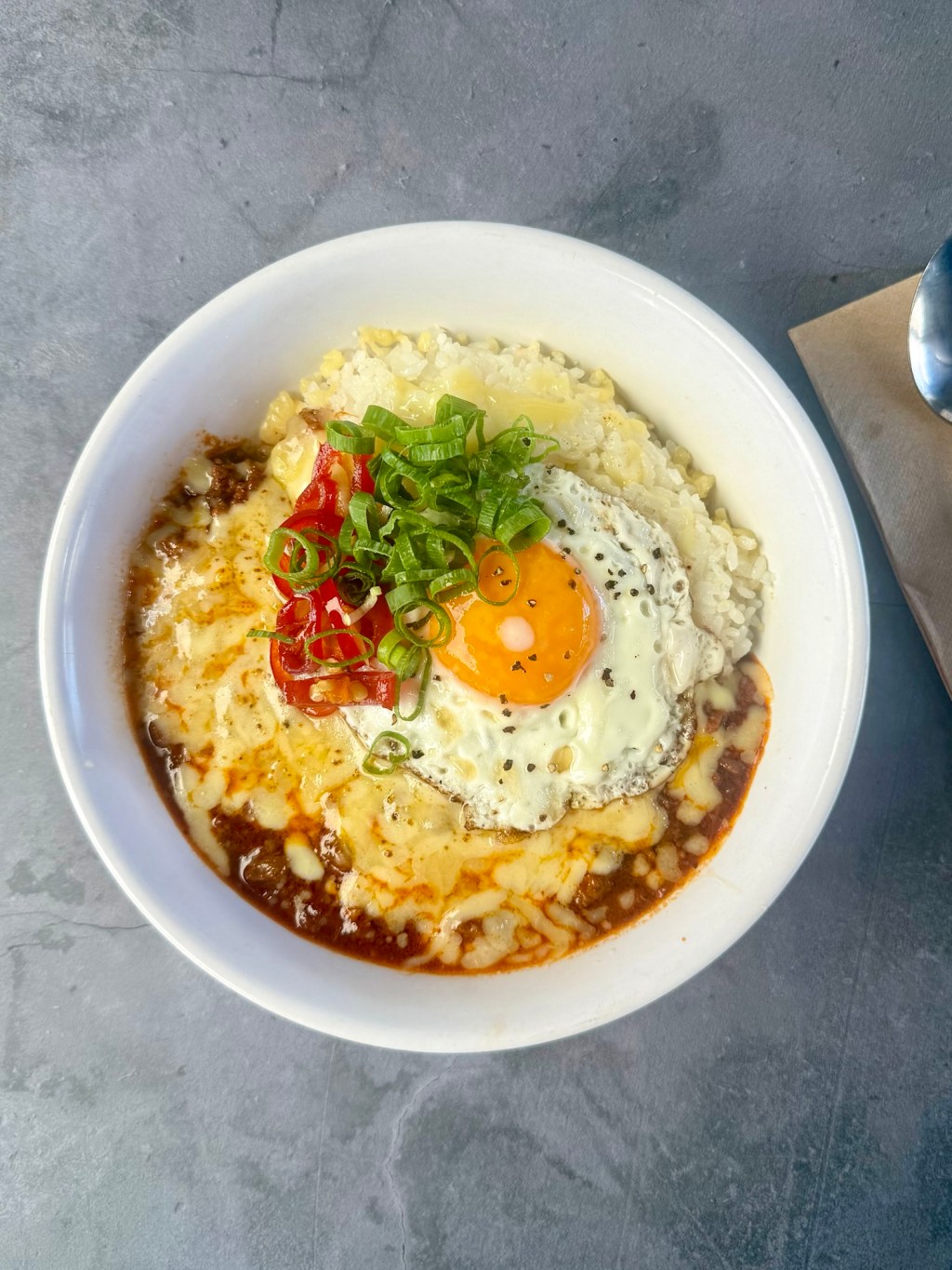 In a bowl with rice, gratinate cheese on top of that, add a fried egg and pickled chillies (peppers).